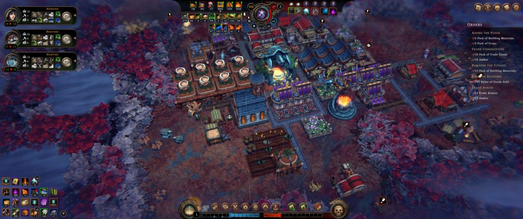 Construction and building design is good, with lots of different shapes and sizes requiring some sector-planning Tetris to get everything to fit. Sectors are isolated and can specialize, which is nice, but the amount of space you have to sacrifice to things like stability-improving buildings (which are large) makes it difficult to truly specialize sectors. Workers can’t travel from one sector to another, so you can’t, say, have a food-and-housing sector and an industrial sector – the housing, food, and medical facilities have to be present in every sector. (Though food production can be located in a different sector and exported where needed.)