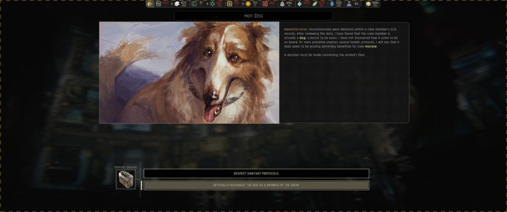However, there are some penalties that just don’t make sense. There’s a -1 stability penalty for having a lot of colonists in cryo-pods, which encourages the player to simply leave people behind instead of rescuing them. In this case, the penalty is again to prevent the player from being over-prepared by having people available to replace any lost by random accidents, but just as before, seems backwards when applied to the game. (And an objective in the first system requires you to recover 500 pods.) Once you’ve unlocked waste recycling (which seems to come later in the tech tree than it should for an advanced mobile space station), there’s a penalty for storing waste rather than purging it into space. Here, the penalty seems to balance the power of recycling, since it essentially makes you self-sufficient.