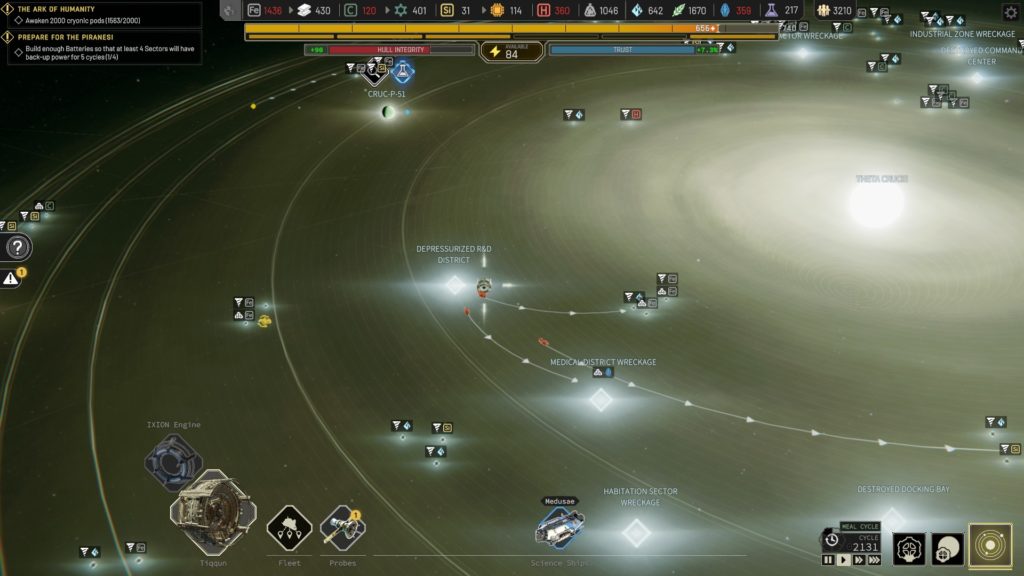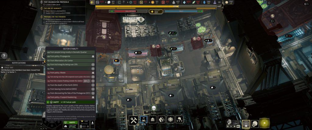 Aside from the arbitrary penalties, this space station capable of travelling through space and time seems to be held together with duct tape and chewing gum. In Frostpunk, you have to keep a stockpile of coal to keep the generator burning. In IXION, your space station is constantly deteriorating and requires constant repair; and those repairs require the same resource used to build structures; sometimes you get to choose between housing your population or repairing the station. (Though if you have to make that choice, you’re already losing.) The speed of the deterioration increases as you progress (with each jump both lowering your maximum hull integrity and permanently increasing the deterioration rate), and each sector you open permanently increases the deterioration rate. I think a better (and more logical) choice would be to have jumps damage your hull (requiring repairs at the start of each system) without causing constant deterioration. Opening new sectors should have no effect on deterioration (I just don’t get that at all). Moving your station should and does deteriorate your hull, as positioning is a powerful mechanic and makes a good trade-off.